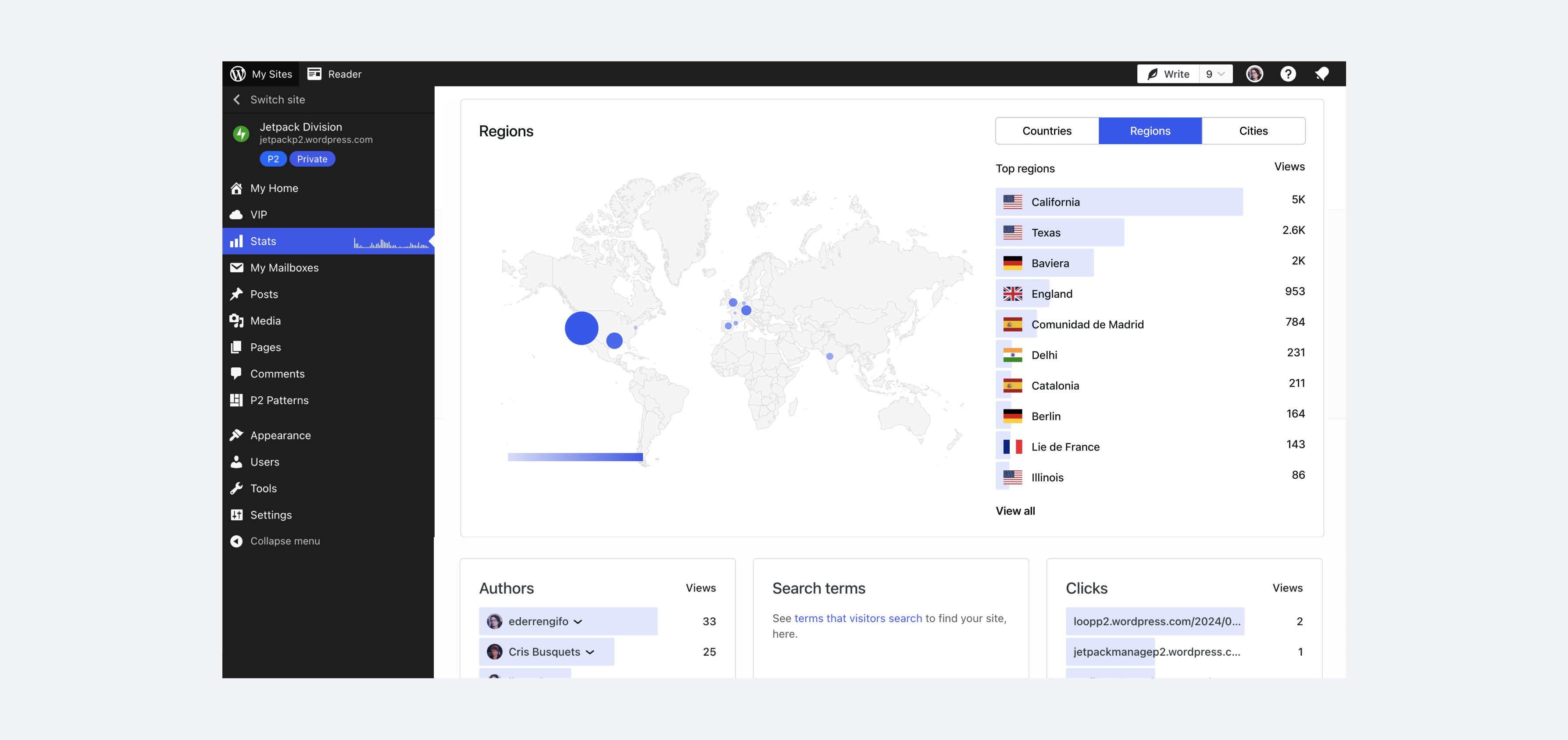 Locations module gives paying customers a more detailed view of their visitor data. Site owners can break down the visit stats by country, region, and city—providing deeper insights into their audience.